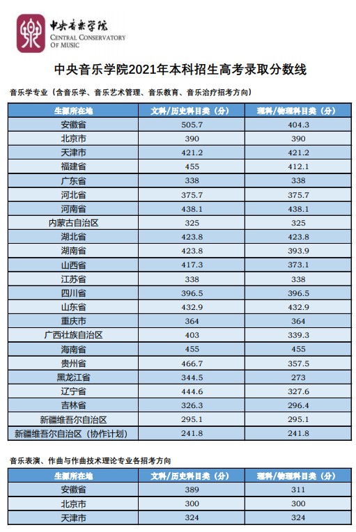 2021年中央音樂學(xué)院錄取分?jǐn)?shù)線