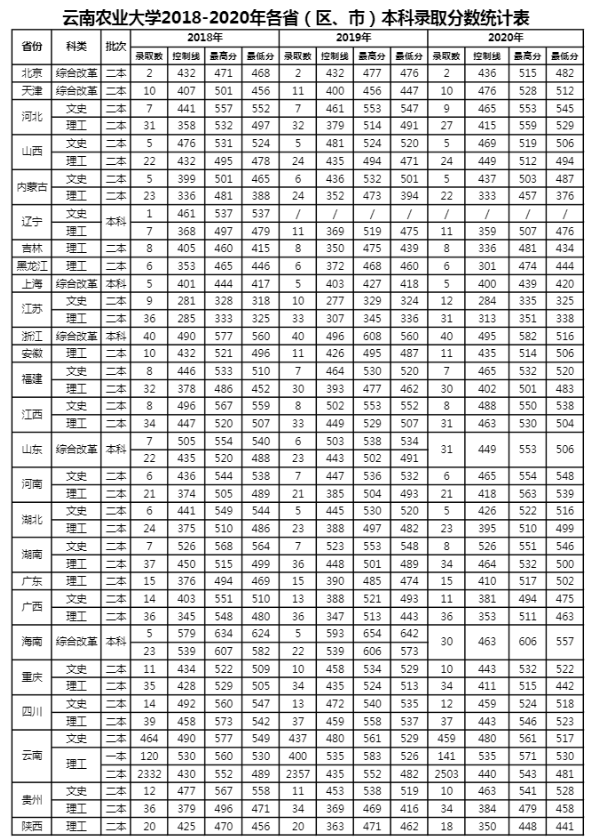 想要報考云南農(nóng)業(yè)大學的同學,都比較關注云南農(nóng)業(yè)大學今年的錄取分數(shù)線,那么,高考多少分可以上云南農(nóng)業(yè)大學呢?云南農(nóng)業(yè)大學歷年最低錄取分數(shù)線是多少?下面為大家整理了云南農(nóng)業(yè)大學錄取分數(shù)線,希望對大家有所幫助,僅供參考。![]() 2018-2020云南農(nóng)業(yè)大學錄取分數(shù)線 ![]() ![]() 云南農(nóng)業(yè)大學是公辦還是民辦大學? 根據(jù)全國高等學校信息可知,云南農(nóng)業(yè)大學是公辦大學。通常來說,公辦大學學費便宜,民辦大學學費較貴。 ![]() 云南農(nóng)業(yè)大學簡介 云南農(nóng)業(yè)大學(Yunnan Agricultural University,YAU),簡稱“云農(nóng)大”,坐落在春城—云南省昆明市,為云南省屬重點大學,入選國家卓越農(nóng)林人才教育培養(yǎng)計劃和卓越工程師教育培養(yǎng)計劃,是全國第二批深化創(chuàng)新創(chuàng)業(yè)教育改革示范高校、全國創(chuàng)新創(chuàng)業(yè)典型經(jīng)驗高校、國家“2011計劃”建設單位、中國政府獎學金來華留學生接收院校,具有研究生推免資格高校,擁有博士學位和碩士學位授予權,設有中國-東盟教育培訓中心。 云南農(nóng)業(yè)大學歷史可追溯到1907年創(chuàng)辦的云南農(nóng)業(yè)學堂,1938年國立云南大學農(nóng)學院創(chuàng)辦,建址昆明市呈貢縣;1958年獨立建成昆明農(nóng)林學院,遷址昆明北郊黑龍?zhí)丁?962年滇南大學、滇西大學并入昆明農(nóng)林學院,1969年搬遷至大理州賓川縣,1970年遷至原曲靖地區(qū)尋甸縣,1971年與云南農(nóng)業(yè)勞動大學合并成立云南農(nóng)業(yè)大學,1980年搬回昆明北郊黑龍?zhí)丁?004年,云南省建筑工程學校、云南省香料研究開發(fā)中心并入云南農(nóng)業(yè)大學。2014年,云南熱帶作物職業(yè)學院并入云南農(nóng)業(yè)大學。 通過對云南農(nóng)業(yè)大學錄取分數(shù)線的了解,大家大概知道了高考多少分可以上云南農(nóng)業(yè)大學,以上數(shù)據(jù)源于網(wǎng)絡,僅供參考,大家如果想要了解其他大學錄取分數(shù)線、大學簡介、大學排行榜、專業(yè)選擇等內(nèi)容,請點擊訪問:大學欄目。 推薦閱讀: 新疆大學錄取分數(shù)線 西藏大學錄取分數(shù)線 喀什大學錄取分數(shù)線 石河子大學錄取分數(shù)線 蘭州大學錄取分數(shù)線 高考多少分可以上寧夏大學? 西北師范大學錄取分數(shù)線 |