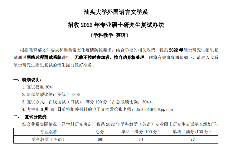 相信2023年考研的同學(xué)很多都十分關(guān)注,2023汕頭大學(xué)考研分數(shù)線,那么,2023年汕頭大學(xué)研究生分數(shù)線是多少呢?為了給大家提供方便,特整理了2023年汕頭大學(xué)研究生分數(shù)線(含2022-2023年),希望可以幫助到大家。![]() 汕頭大學(xué)2023年碩士研究生招生復(fù)試與錄取辦法 根據(jù)教育部關(guān)于印發(fā)《2023年全國碩士研究生招生工作管理規(guī)定》的通知(教學(xué)〔2022〕3號)等文件精神和我校2023年碩士研究生招生簡章,2023年我校碩士研究生招生錄取工作將堅持“按需招生、德智體美勞全面發(fā)展、擇優(yōu)錄取、寧缺毋濫”的原則,以提高人才選拔質(zhì)量為核心,在確保安全性、公平性和科學(xué)性的基礎(chǔ)上,現(xiàn)將我校碩士研究生復(fù)試有關(guān)工作安排通知如下: 一、復(fù)試形式 經(jīng)綜合研判和結(jié)合學(xué)校實際情況,我校2023年碩士研究生招生考試復(fù)試采用線下或線上方式進行,具體復(fù)試方式請參見我校各招生學(xué)院復(fù)試方案。 二、復(fù)試方案 各招生學(xué)院研究生招生工作領(lǐng)導(dǎo)小組根據(jù)教育部和學(xué)校相關(guān)要求,根據(jù)本單位特點制定各招生學(xué)科(專業(yè))復(fù)試方案并在本單位網(wǎng)站發(fā)布通知,考生須及時查看相關(guān)學(xué)院網(wǎng)站通知。復(fù)試方案應(yīng)包含復(fù)試方式、復(fù)試時間、復(fù)試分數(shù)線、復(fù)試內(nèi)容、復(fù)試流程、評分標準、初試和復(fù)試成績占比以及錄取辦法及聯(lián)系方式。 三、資格審查 復(fù)試前對考生資格進行審查,復(fù)試資格審核所需要材料須考生提前準備,并按照各招生學(xué)院通知要求進行提交,資格審查未通過的考生將取消復(fù)試資格。 資格審查以下材料: 1.身份證(正反面):信息是否與本人相符。 2.成績單:大學(xué)期間成績單原件(加蓋學(xué)校公章的原件)或檔案中成績單復(fù)印件(需加蓋檔案所在單位公章的原件)。 3.應(yīng)屆本科畢業(yè)生:審查學(xué)生證。 4.往屆本科畢業(yè)生:審查畢業(yè)證和學(xué)位證(境外學(xué)歷證書還須提供教育部留學(xué)服務(wù)中心的認證證明)。 5.同等學(xué)力考生:其中高職高專生審查??飘厴I(yè)證書;本科結(jié)業(yè)生審查本科結(jié)業(yè)證書等。 6.學(xué)歷學(xué)籍核驗結(jié)果(應(yīng)屆生交驗《教育部學(xué)籍在線驗證報告》、往屆生交驗《教育部學(xué)歷證書電子注冊備案表》)。 7.思想政治素質(zhì)和品德考核表:加蓋相關(guān)部門公章的《汕頭大學(xué)研究生招生思想政治素質(zhì)和品德考核表》(附件1)(由檔案所在單位或工作所在單位、戶口所在地出具并蓋章)。 8.原則上所有非全日制考生均需是在職定向人員。非全日制考生審查《非全日制考生資格審查表》(附件2),其中MBA、MPA、教育管理(代碼:045101)考生須是:大學(xué)本科畢業(yè)后有3年或3年以上工作經(jīng)驗的人員;獲得國家承認的高職高專畢業(yè)學(xué)歷或大學(xué)本科結(jié)業(yè)后,達到大學(xué)本科畢業(yè)同等學(xué)力并有5年以上工作經(jīng)驗的人員;已獲得碩士學(xué)位或博士學(xué)位并有2年以上工作經(jīng)驗的人員。 9.《汕頭大學(xué)2023年碩士研究生招生考試誠信復(fù)試承諾書》(附件3)(須考生親筆簽名)。 10. 符合《教育部關(guān)于印發(fā)<2023年全國碩士研究生招生工作管理規(guī)定>的通知》(教學(xué)〔2022〕3號)加分政策的考生,須提供聘用期滿考核合格工作證書或《入伍批準書》和《退出現(xiàn)役證》掃描件。 考生要確保所有提交材料真實,誠信守規(guī)參加復(fù)試。對在復(fù)試過程中有違規(guī)行為,影響公平、公正的考生,一經(jīng)查實,一律按照《國家教育考試違規(guī)處理辦法》(教育部令33號)等規(guī)定嚴肅處理。入學(xué)后3個月內(nèi),學(xué)校將按照《普通高等學(xué)校學(xué)生管理規(guī)定》有關(guān)要求,對所有考生進行全面復(fù)查。 四、復(fù)試內(nèi)容 1、考生按照各學(xué)院要求參加復(fù)試。復(fù)試考核內(nèi)容包括專業(yè)知識、英語水平測試、綜合素質(zhì)考核三部分,滿分為100分,各招生學(xué)院可根據(jù)學(xué)科特點選擇考核方式及調(diào)整內(nèi)容比例。面試時間一般每生不少于20分鐘。 復(fù)試成績不合格者,不予錄取。 2、對于同等學(xué)力考生,須進行全面、嚴格的復(fù)試。主要是加強對本科主干課程和科研能力的考查,其中筆試科目不少于兩門。加試科目不得與初試科目相同,考試時間每門為3小時,試卷滿分為100分。同等學(xué)力考生的筆試命題和考務(wù)組織工作由各學(xué)科負責(zé)。 報考法律碩士(非法學(xué))、工商管理碩士和公共管理碩士的同等學(xué)力考生不加試。 五、調(diào)劑 調(diào)劑到我校的考生,要符合《教育部關(guān)于印發(fā)<2023年全國碩士研究生招生工作管理規(guī)定>的通知》規(guī)定的基本條件,初試成績不得低于我校各招生學(xué)院2023年碩士研究生復(fù)試分數(shù)基本要求。凡是涉及到調(diào)劑的考生,必須通過教育部指定的“全國碩士生招生調(diào)劑服務(wù)系統(tǒng)”報名。 六、錄取 學(xué)院根據(jù)本單位招生計劃、復(fù)試錄取辦法以及考生初試和復(fù)試成績、思想政治表現(xiàn)、身心健