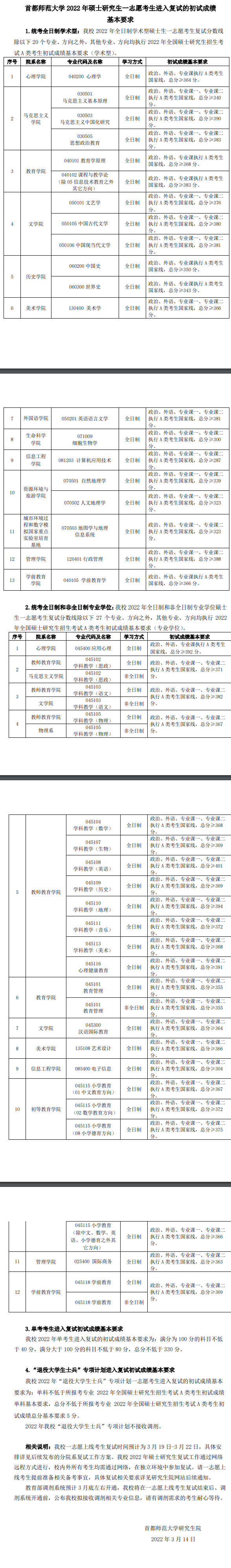 我校2023年單考生進入復(fù)試的初試成績基本要求為:滿分為100分的科目不低于40分,滿分大于100分的科目不低于80分,總分不低于330分。 4.“退役大學(xué)生士兵”專項計劃進入復(fù)試初試成績基本要求 我校2023年“退役大學(xué)生士兵”專項計劃一志愿考生進入復(fù)試的初試成績基本要求為:總分不低于所報考專業(yè)2023年全國碩士研究生招生考試A類考生初試成績總分基本要求,單科成績不作要求。 2023年我校“退役大學(xué)生士兵”專項計劃為8個,該專項計劃不接收調(diào)劑。 相關(guān)說明:我校2023年碩士研究生一志愿上線考生與調(diào)劑考生復(fù)試分開進行,一志愿上線考生與調(diào)劑考生復(fù)試均為線下進行(考生須到我校參加筆試和面試)。我校一志愿上線考生復(fù)試時間為3月19日至3月26日,具體安排詳見后續(xù)發(fā)布的分院系復(fù)試工作方案。請一志愿上線考生做好相關(guān)備考事宜,復(fù)試相關(guān)要求詳見研究生院網(wǎng)站后續(xù)通知。 我校將在一志愿上線考生復(fù)試結(jié)束后、調(diào)劑系統(tǒng)開通前,公布我校擬接收調(diào)劑相關(guān)專業(yè)信息,請有調(diào)劑需求的考生耐心等待。 2022年首都師范大學(xué)研究生分?jǐn)?shù)線一覽表 ![]() 2022年考研國家復(fù)試線 ![]() ![]() 《2023年首都師范大學(xué)研究生分?jǐn)?shù)線一覽表》就為大家介紹到這里,如果想要了解歷年考研分?jǐn)?shù)線、國家線、考研復(fù)試分?jǐn)?shù)線、最新考研時間、考研復(fù)習(xí)技巧等內(nèi)容,請點擊訪問:考研欄目。 |